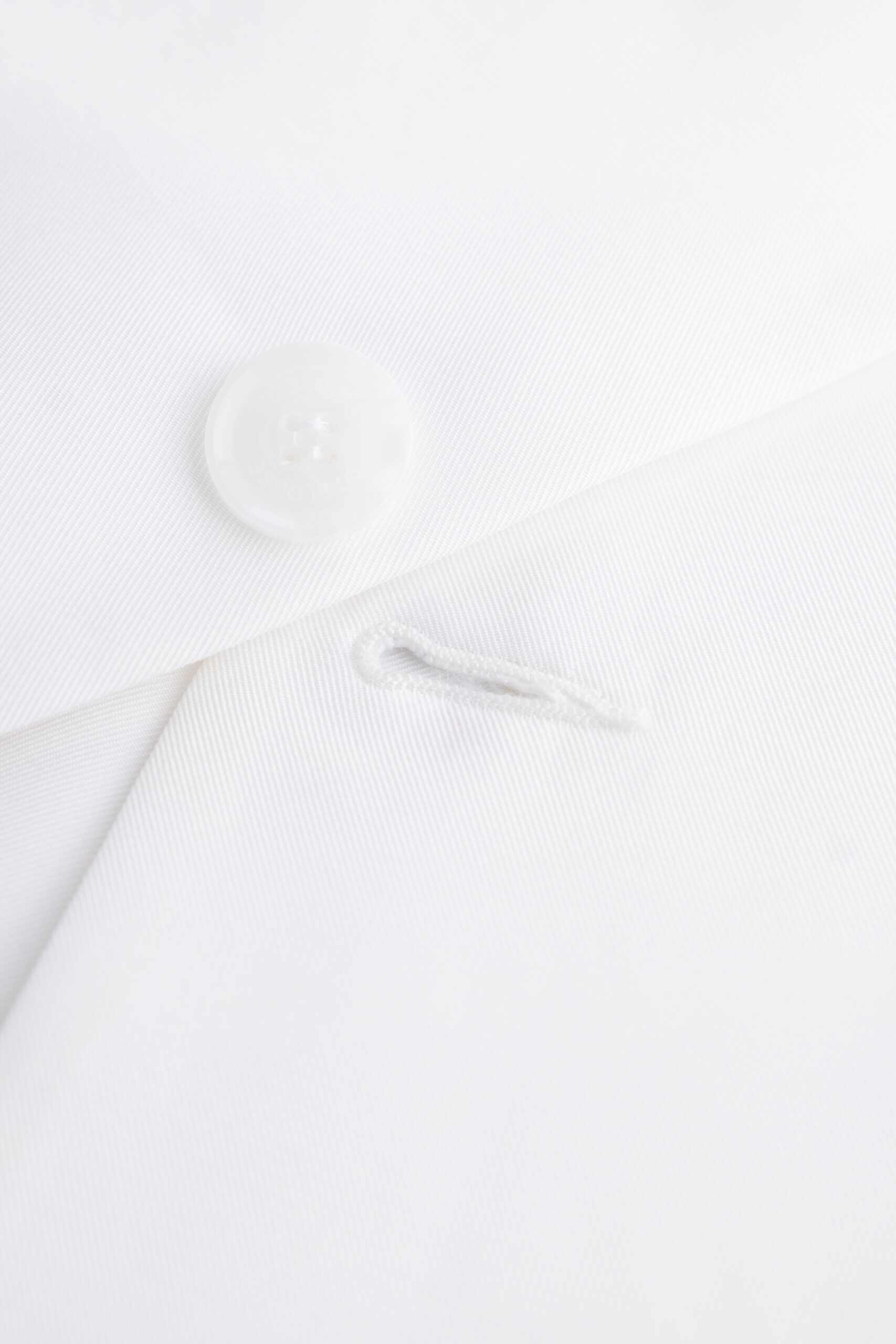 Chất liệu cotton chéo nhẹ, ít nhăn, ít bám bẩn. Phía trong tà áo trước may phủ lót và có đệm vai như áo vest.